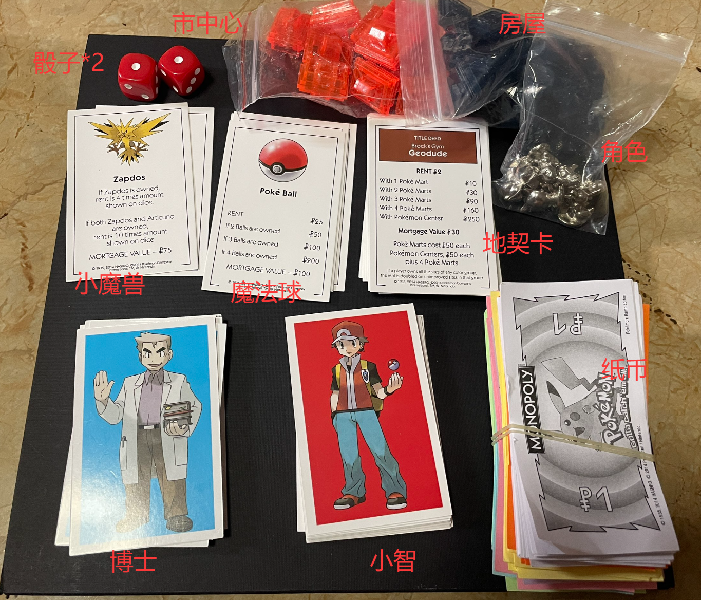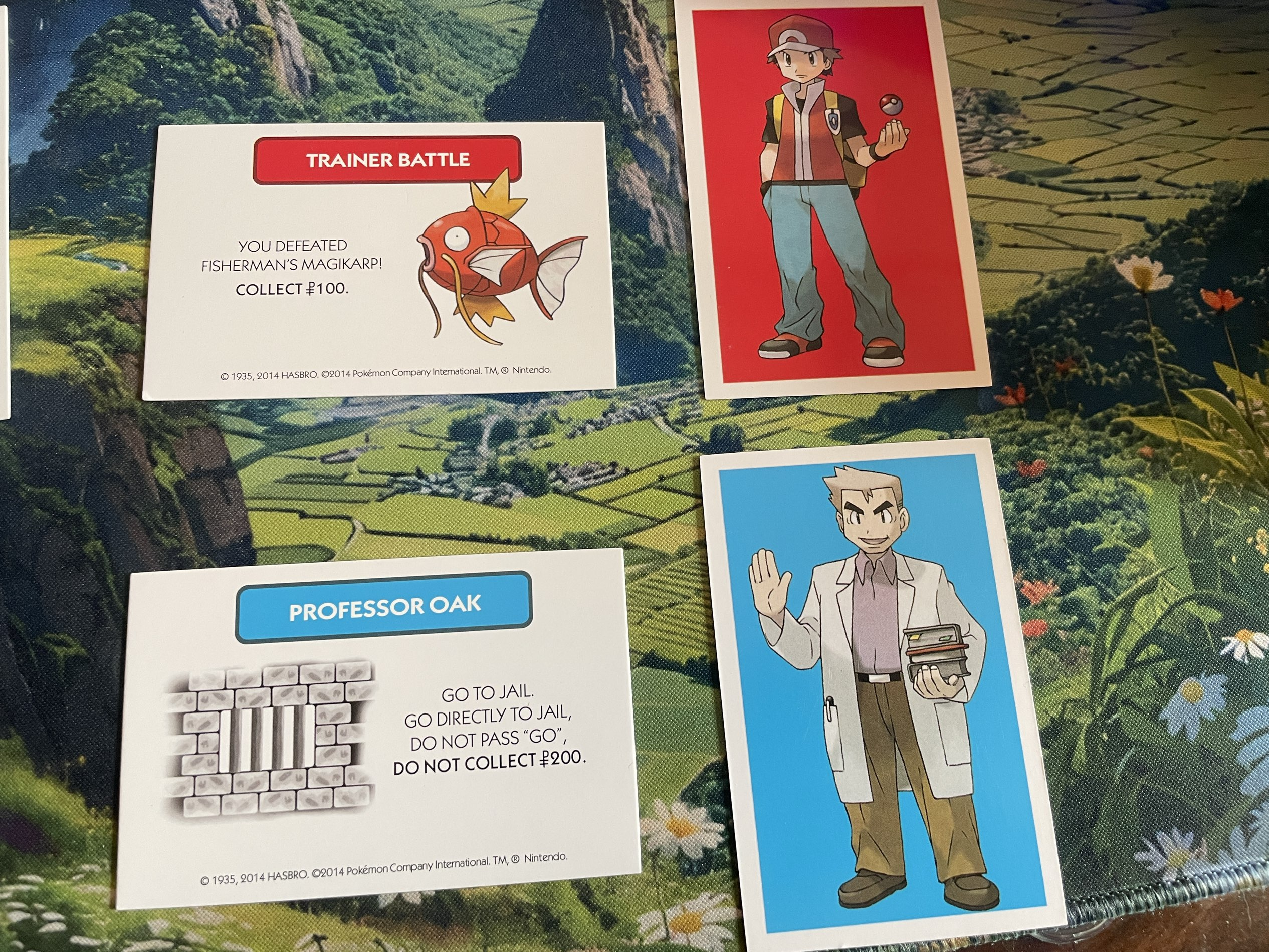 - 洗混 Professor Oak (大木博士/机会卡) 和 **Trainer Battle (训练家战斗/命运卡)**,背面朝上放在地图中央对应区域。